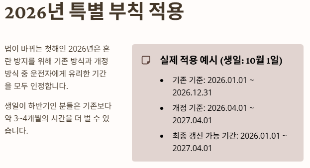 법이 바뀌는 첫해인 2026년은 혼란을 방지하기 위해 기존 방식(연도 기준)과 개정 방식(생일 기준) 중 운전자에게 유리한 기간을 모두 인정해 줍니다. 이를 ‘부칙에 따른 기간 연장’이라고 합니다.