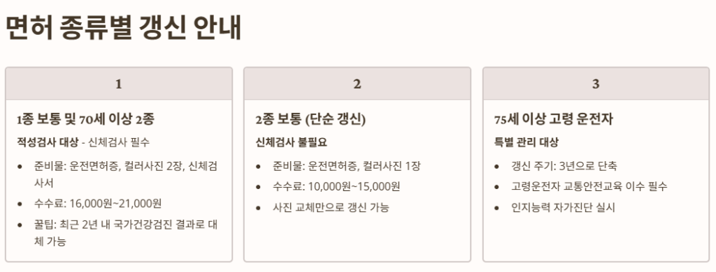 - 특이사항: 신체검사 없이 사진 교체만으로 갱신 가능 (단, 70세 이상은 적성검사 대상)