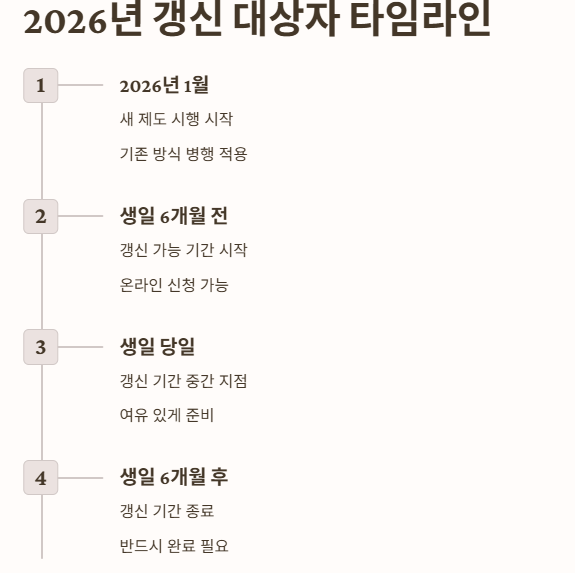 2026년부터는 본인의 생일을 기점으로 앞뒤로 각 6개월씩, 총 1년의 기간 내에 갱신을 완료하면 됩니다.