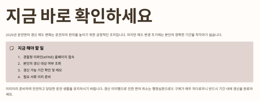 2026년 운전면허 갱신 제도의 변화는 운전자의 편의를 높이기 위한 긍정적인 조치입니다. 하지만 제도 변경 초기에는 본인의 정확한 기간을 착각하기 쉽습니다.