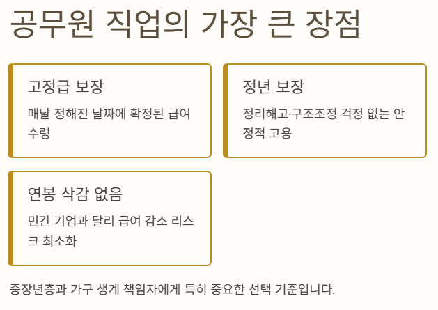 특히 중장년층이나 가구 생계를 책임지는 분들에게는 이 안정감이 매우 중요한 직업 선택 기준이 될 수 있습니다.