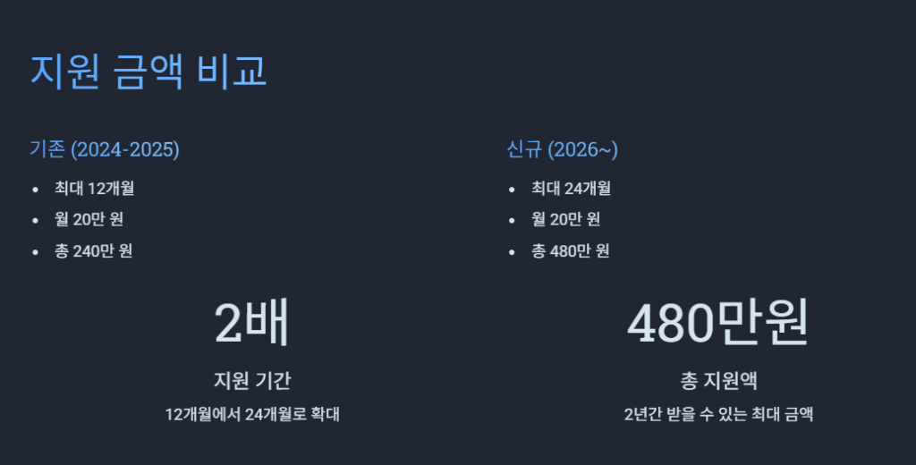 가장 파격적인 변화는 지원 기간입니다. 기존 최대 12개월(240만 원)이었던 지원 기간이 최대 24개월(480만 원)로 두 배 늘어납니다. 이는 사회초년생들이 주거 걱정 없이 저축을 늘리고 자립의 발판을 마련하는 데 실질적인 도움을 줄 것입니다.